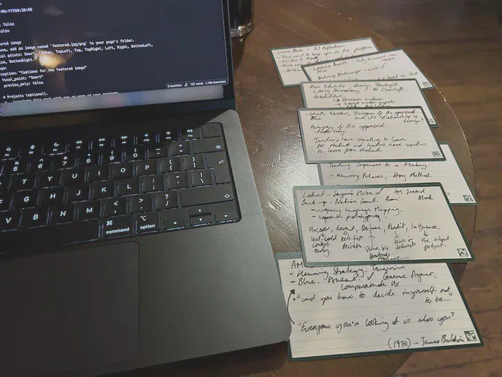 Index card notes are spread out on a pub table next to a laptop with a pint of Guinness behind