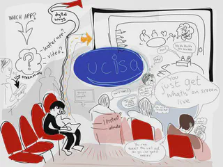 Well I am more actively involved in designing the gamification of Spotlight this year, so there will be more on that soon too! One of the things that I am most looking forward to, as part of the Spotlight conference is a live debate that will take on the question: Do we still need IT training teams? This session will take the format of a town-hall forum style debate and will have a panel who explore different views on the topic as well as leading audience discussion. Part of the inspiration for the debate came from my experience attending New Media Consortium conferences from 2010-12 in the US. I remember the sheer energy of the townhall meeting events and the brilliant live drawing visualisations of the discussion, supplied by Rachel Smith. So with this in mind we are working with Brighton artist, Eve Turner-Lee to consider the best ways of visualising our discussion! Back in March, Eve, my colleague Tucker and I met up to test out the best ways of visualising drawing. Our criteria were that whichever solution we ended up with would need to capture the drawing live and provide a video feed to the projection system somehow so that attendees could watch on screen. A bonus would be if attendees could also watch live from their own smartphones, tablets or laptops. Here are the results of our investigations. Although Eve put it much more succinctly in her comic strip embedded at the top of this post!